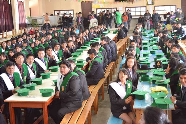 Recibieron ayer el grado académico de Licenciados en el Modelo Educativo Sociocomunitario Productivo 205 estudiantes en las especialidades de Educación Primaria Comunitaria Vocacional, Matemática, Educación Musical, Valores, Espiritualidades y Religiones y Comunicación y Lenguajes.