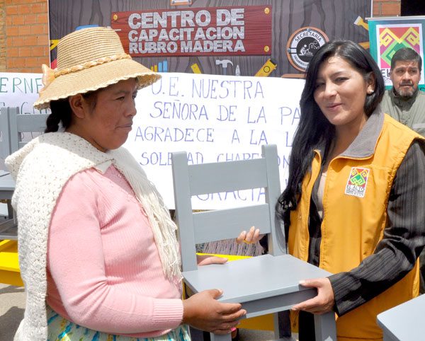 El Centro de Capacitación Permanente en el Rubro de Madera donó 100 sillas y 50 mesas producidas durante las capacitaciones gratuitas que la Alcaldía de El Alto brindó a 20 artesanos alteños.