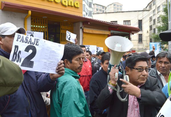 Los dirigentes sindicalizados megáfono en mano y con carteles pretendían imponer por la fuerza la tarifa de Bs 2. Esta determinación fue rechazada por la ciudadanía, debido a que este sector no cumple con sus compromisos, continúa el mal servicio con vehículos inadecuados, (viejos y con poco espacio), no respetan las señalizaciones y sigue el maltrato contra los usuarios, además de persistir los trameajes en diferentes zonas de La Paz y El Alto con tarifas arbitrarias.