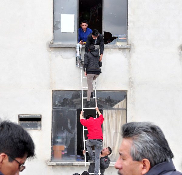 En el sector izquierdo del inmueble, la desesperación de la gente que se quedó encerrada con el riesgo de asfixiarse, ocasionó que tratarán de salir por la ventana ayudados por sus compañeros que estaban en la terraza, gracias a una escalera, con el riesgo de caer al vacío en el intento.