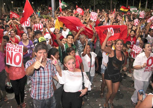 Seguidores de los partidos y organizaciones contrarias al actual Gobierno de las ciudades de Potosí, Beni, Santa Cruz, Chuquisaca y Oruro salieron a las calles a festejar los resultados de conteo rápido y boca de urna, luego de conocer los resultados que le dan una estrecha la victoria al “no” en el referéndum constitucional, según los informes de las empresas Mori e Ipsos.