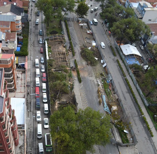 Los trabajos de la Línea Blanca del teleférico provocaron el cierre del carril de subida de la avenida Busch, en la zona de Miraflores, lo cual significó un perjuicio para los choferes y pasajeros que debían usar aquella vía, según informaron los usuarios del transporte público.