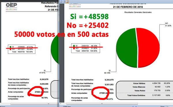 A su vez, un grupo de jóvenes asistentes al cómputo de La Paz, informaron a EL DIARIO que cuando revisaban las páginas digitales del Tribunal Supremo Electoral (TSE) observaron que entre las 17.45 horas y las 18.02 de ayer, desaparecieron 10.800 votos del NO. Cuando pidieron explicación de las autoridades electorales sobre tal hecho, les respondieron que, de todos modos, el NO estaba ganando.