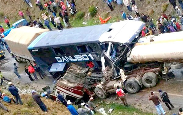 Un bus de la empresa Danubio, que partió de la ciudad de Cochabamba con destino a Oruro, chocó ayer con un camión cisterna, que dejó un saldo de seis muertos y 20 heridos, en el kilómetro 160 de la carretera Cochabamba – Oruro, según reporte policial.