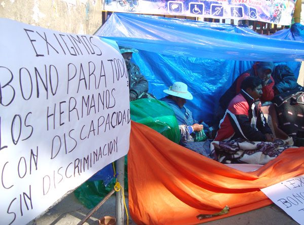 El ejecutivo de las Personas con Discapacidad de la ciudad de El Alto, Jorge Flores, informó que 18 personas afiliadas a su sector instalaron una huelga de hambre, exigiendo la creación de un bono mensual de Bs 500.