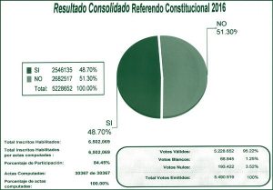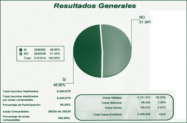 Los votos válidos por la opción del NO suman 2.682.517, que equivale al 51.3 %, en tanto que los votos válidos por la opción del SI fueron 2.546.135, que equivalen al 48.70 %.