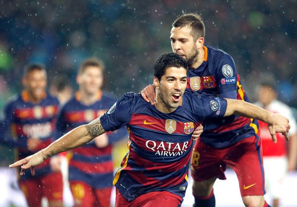 El Barcelona jugará por novena vez seguida los cuartos de final de la Liga de Campeones, al eliminar al Arsenal por 3-1 (5-1 en el global), gracias a tres goles del tridente azulgrana (Neymar, Suárez y Messi), que firmaron el triunfo de su equipo, que jugó a medio gas ante un esforzado equipo inglés.
