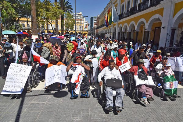 Cerca de dos centenares de discapacitados, representantes de ocho departamentos, comenzaron su movilización desde la plaza 14 de Septiembre de Cochabamba hasta la ciudad de La Paz; exigen un bono mensual de 500 bolivianos.