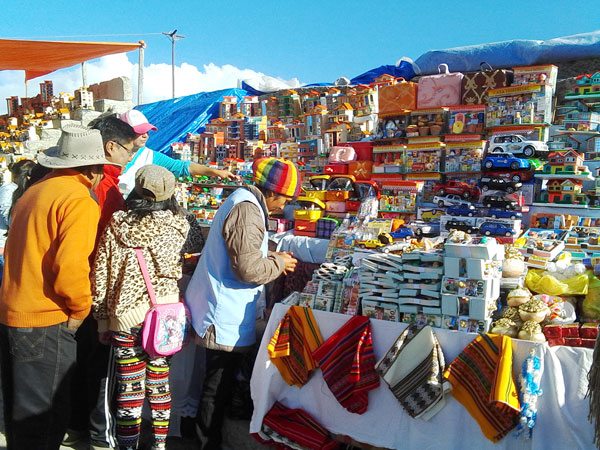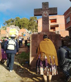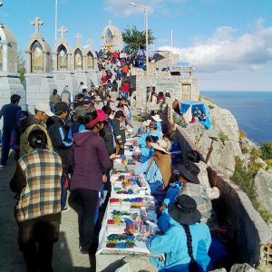 Una vez que los feligreses llegan hasta cúspide del Calvario se encuentran con la mezcla de dos costumbres, una totalmente católica y la otra andina, puesto que en el lugar, desde donde se evidencia una vista panorámica de la bahía y el pueblo de Copacabana, se encuentran también no solo con imágenes católicas, sino con artesanía en miniatura, igual como sucede en la Alasita.