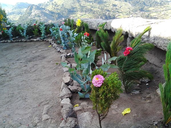 En la parte posterior del Calvario, en la bajada, también se encuentra a la gente del lugar que delimita pequeños terrenos de 20 centímetros aproximadamente, las cuales son vendidos a los creyentes.