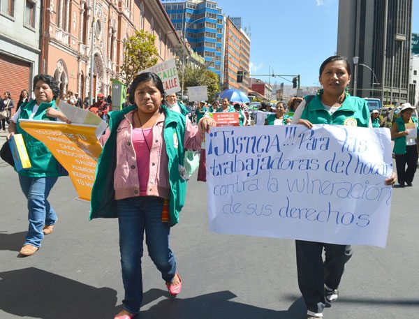 La dirigente lamentó la vulneración de los derechos hacia las trabajadoras del hogar, puso como ejemplo salarios que oscilan entre los 500 y 1.000 bolivianos por más de 15 horas de trabajo. “No se cumplen las ocho horas de trabajo y ninguna tiene permiso ni seguro de salud, además los empleadores buscan a mujeres que llegan del campo porque no tienen familia, les hacen trabajar sábados, domingos y feriados porque no tiene a dónde ir”, acotó.
