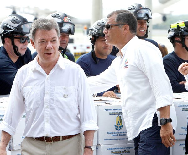 Tras recorrer las zonas afectadas en el sector de Tarqui, en Manta, y entregar vituallas, Santos reiteró su solidaridad con Ecuador, país al que, además, le transmitió sus condolencias por los muertos que dejó el terremoto, entre ellos once colombianos.