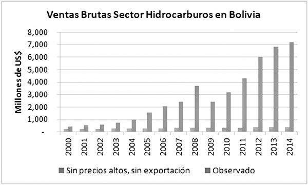 El total de ventas brutas del sector hidrocarburos presenta en dos escenarios, el primero no considera el contrato de exportación de gas natural al Brasil (tampoco Argentina) y mantiene los precios de los hidrocarburos en los niveles observados el año 2000; el segundo, presenta los ingresos brutos del sector hidrocarburos en Bolivia efectivamente observados, es decir, incluyendo las exportaciones y el efecto de los elevados precios internacionales del petróleo.