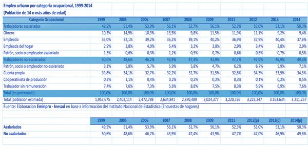De acuerdo con estudios de la experta en temas laborales, Beatriz Muriel, economista del Instituto de Estudios Avanzados en Desarrollo (Inesad), los empleados son los que más trabajo logran en el grupo de los asalariados, mientras que en el no-asalariados son los cuentapropistas (informales) los que ocupan la segunda posición. Empero, en el caso de los asalariados, el aumento de los costos laborales puede afectarles gravemente, ya sea con despidos o la no creación de nuevos puestos de trabajo.