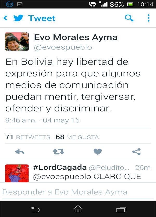 A las 24 horas después de conmemorarse el Día Mundial de la Libertad de Prensa, el presidente Evo Morales, mediante su cuenta en Twitter, aseguró que los medios de comunicación utilizan esa libertad para mentirle a la sociedad. Ese mensaje recibió muchas respuestas de apoyo, pero especialmente de desaprobación de parte de los usuarios de esta red social.