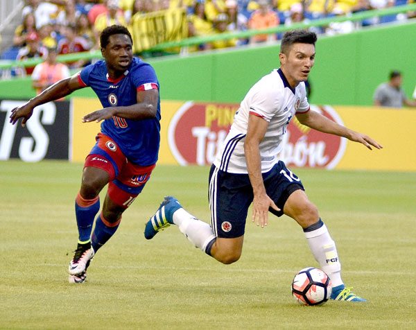 El equipo que dirige Pekerman contó con varias oportunidades para ampliar el marcador. Pese a que Colombia contó con mejores ocasiones, Haití hizo el empate en el minuto 34 cuando Wilde Donald Guerrier se zafó de la defensa de Pérez y remató con un gran cabezazo por el lado izquierdo. Antes del descanso, Max Hilaire fue expulsado por doble tarjeta amarilla y dejó a Haití con diez jugadores,.