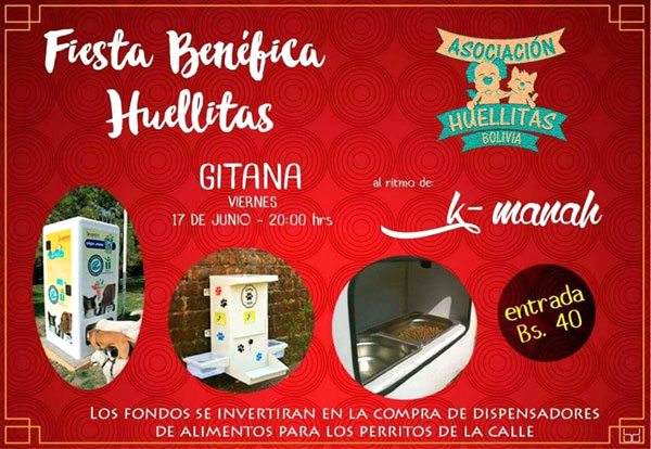 Con la intensión de adquirir dispensadores de alimentos y agua, que puedan alimentar a los perros callejeros, la Asociación Huellitas Bolivia realizará una fiesta de beneficencia en la ciudad de La Paz, este viernes.