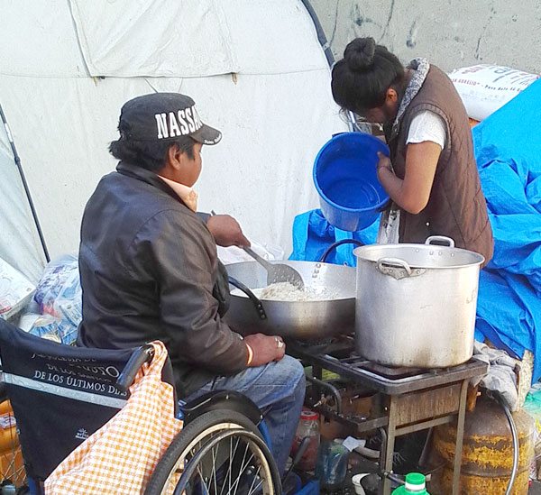 Las personas con discapacidad, en medio de la indiferencia del Gobierno, pernoctan en la ciudad de La Paz 56 días de vigilia y movilización, pero su salud se deteriora y requieren de vegetales y carnes para preparar sus alimentos.