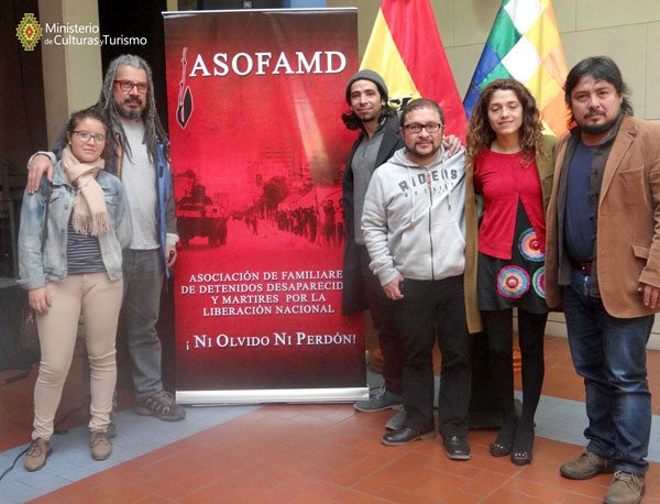 La Asociación de Familiares de Detenidos Desparecidos y Mártires por la Liberación Nacional (Asofamd) y artistas bolivianos formaron lunes la 'Red de artistas por la memoria histórica' para impulsar una alianza entre organizaciones y artistas comprometidos en la búsqueda de la verdad, memoria y la justicia de la época de la dictadura en Bolivia y Latinoamérica.