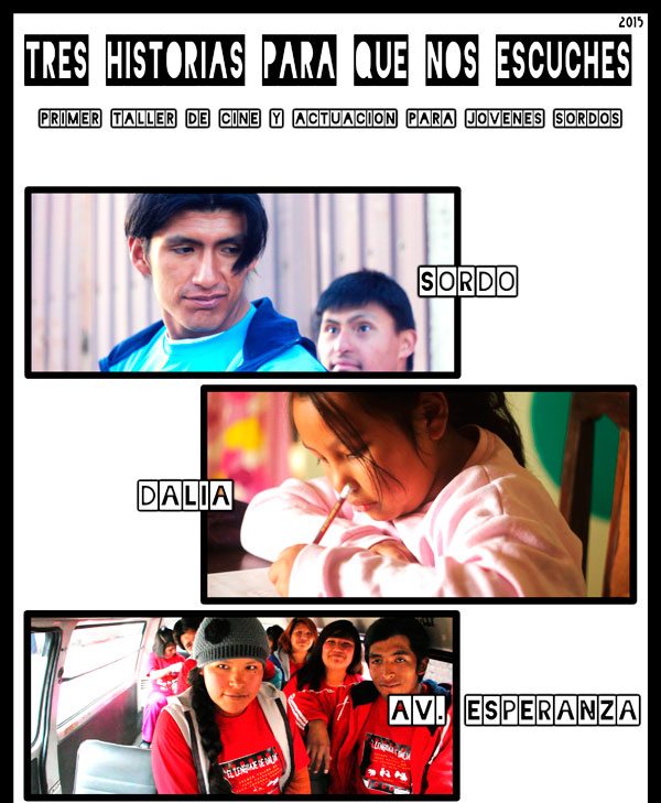 La vida de 18 jóvenes sordos cambió desde que el actor Juan Carlos Aduviri dictó un taller de cine el año pasado. Ese fue el estímulo para que realicen y presenten tres cortometrajes, bajo el rótulo de “Tres historias para que nos escuches”, que reflejan sus experiencias personales. Actualmente los jóvenes están en la elaboración de otros dos trabajos audiovisuales que esperan terminar en agosto próximo. La mayoría de los sordos nunca escuchó la voz de su madre o algún sonido de la naturaleza y su mayor tropiezo es la comunicación. Estos cortos tienen el objetivo de “sensibilizar a la sociedad y hacer conocer que este grupo con discapacidad auditiva puede más que solo (participar en) talleres de panadería o costura, ellos se sienten cómodos actuando, les gusta”, cuenta Delia (D) Ticona, quien junto a su esposo, el videasta Jesús Quispe, son piedra fundamental del proyecto FAPEDA (Familiares Amigos, Personas con Discapacidad Auditiva).