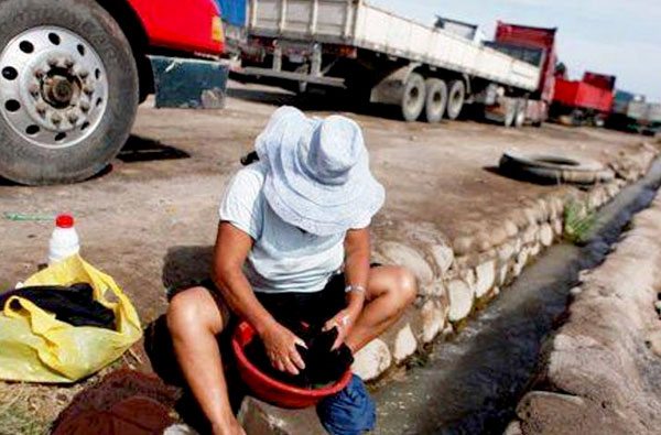 Una foto muestra cómo los trasportistas deben lavar incluso su ropa en canales cercanos a la carretera.