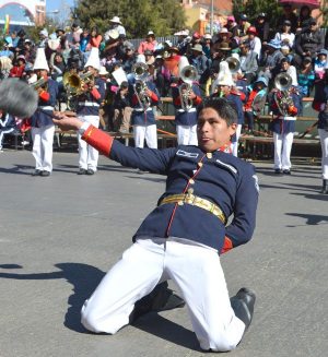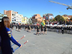 Bandas de guerra y estudiantes, especialmente de los últimos cursos de secundaria, fueron los protagonistas del desfile estudiantil, que comenzó a las 08:30 de la mañana, en la avenida Juan Pablo II, a la altura de la Universidad Pública de El Alto, pasando luego por la avenida Alfonso Ugarte.