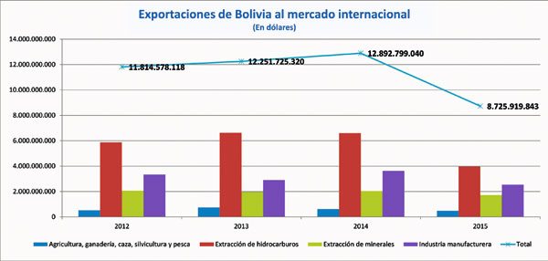 Bolivia, en 2015, registró una baja cifra de las ventas al mercado externo, que llegó a 8.725 millones de dólares, mientras que en 2012 el valor alcanzó a 11.814 millones; en 2013 a 12,251 millones de dólares; en 2014, la más alta, la cifra llegó a 12.892 millones; y en 2015 se cerró con menos valor.