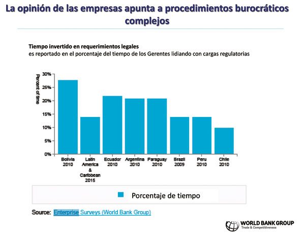 Quijandría indicó en su exposición que Bolivia ocupa el puesto 178 en el mundo, en cuanto a captación de inversiones. Ello se debe a que existen 15 procedimientos burocráticos que hay por seguir, que toman 50 días, lo que se halla bastante lejos del promedio de América Latina y ciertamente mucho más lejos del promedio de países de Europa.