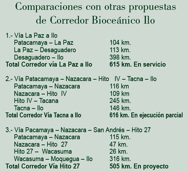 En las mencionadas cartas, se adjuntaron un estudio Técnico Financiero para desarrollar la infraestructura portuaria en Ilo Perú y un cuadro comparativo de distancia para el corredor terrestre que partiendo de Patacamaya llegue al Puerto de Ilo, pasando por el Hito 27 y otras rutas.