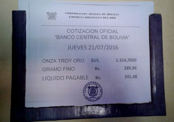 La cotización internacional del metal precioso ha superado la barrera de $us 1.300, la onza troy de 31 gramos. La semana pasada se cotizó en $us 1.348, según reporte del Ministerio de Minería.