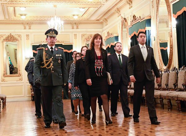 Los embajadores Gwyneh Ann Kuts de Canadá, Jacqueline Emma Caine, de Nueva Zelanda, Alain Brian Bergant de Eslovenia y Burhanul Islam de Pakistán fueron recibidos en Palacio Quemado por el jefe de la Casa de Gobierno y conducidos ante el jefe de Estado, quien los aguardó junto con el canciller David Choquehuanca.