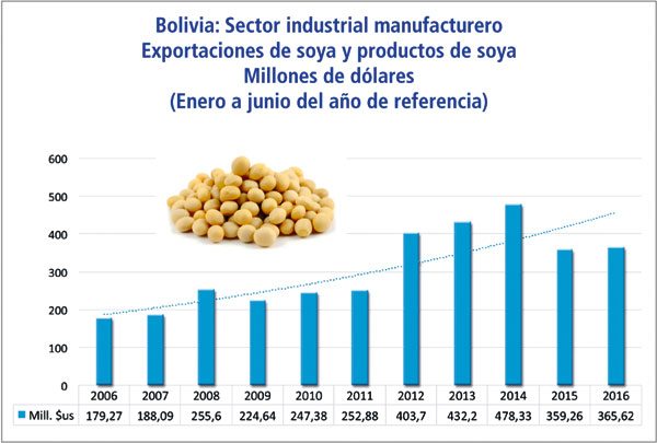En el primer semestre de 2016 las exportaciones de soya y productos de soya sumaron 365 millones de dólares. Entre enero a junio de los últimos 11 años (2006 a 2016) las exportaciones de soya y productos de soya registraron un valor de 3.387 millones de dólares. El 99% de las exportaciones de soya y productos de soya proceden del departamento de Santa Cruz y el 68% de las exportaciones de soya y productos de soya tiene como país destino a Colombia.