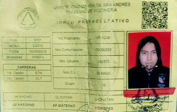 Al momento de ser remitido por Radio Patrullas, el joven portaba su cédula de identidad y una boleta de registro de ingreso a los cursos pre-facultativos de la Carrera de Ingeniería de la Universidad mayor de San Andrés (UMSA).
