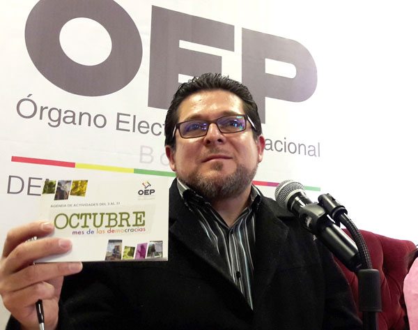 En conmemoración a los 34 años de la recuperación de la democracia en Bolivia, el vocal Exeni presentó la agenda del mes y señaló que cada actividad permitirá conocer y reflexionar sobre diferentes aspectos de la democracia reconocidos por la Constitución Política del Estado (CPE).