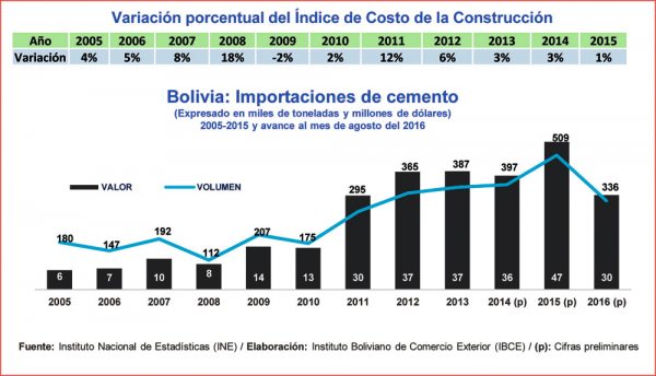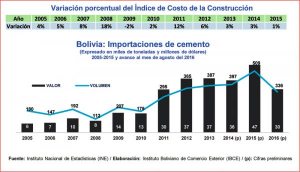 En 2015, Bolivia importó cemento en valor 8 veces más que en el 2005; en cuanto al volumen se triplicó en ese mismo período. En la gestión, el 70 por ciento de las importaciones de cemento tuvieron como origen a Perú, seguido de Brasil con el 27% de participación en el valor.
