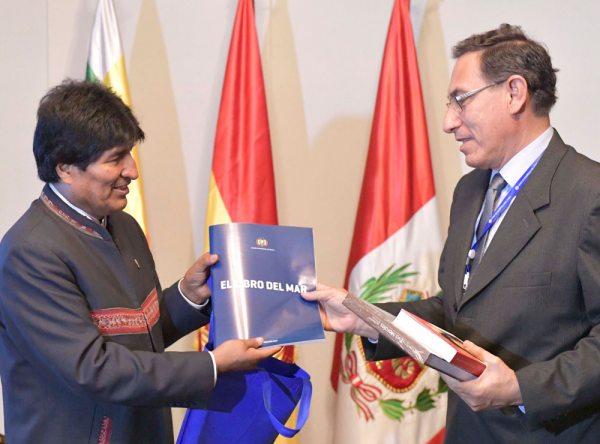 El primer vicepresidente de Perú, durante la reunión que sostuvo con el presidente Morales en la ciudad de Santa Cruz de la Sierra, recibió el Libro del Mar, una publicación que tiene el objetivo de promover la demanda marítima, tema que Bolivia y Chile lo tratan en la Corte Internacional de Justicia (CIJ) de La Haya.