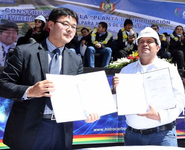 El presidente Evo Morales firmó este miércoles un contrato llave en mano con la corporación coreana, Wonil Eng Cosmo, para la construcción de la planta de tuberías de redes de gas que estará ubicada en la ciudad de El Alto.