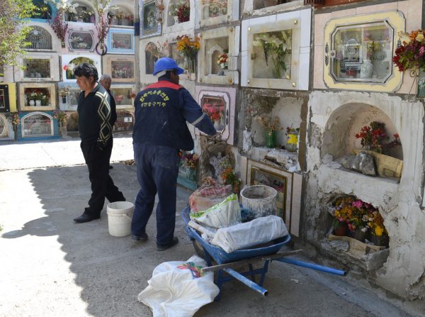 “Las dos asociaciones, la primera de Trabajadores Independientes del Cementerio General (cascos blancos) y la Asociación Primero de Noviembre (cascos azules) acordaron no incrementar los precios en la limpieza y arreglos de los nichos, debido a que en este tipo de trabajos en ocasiones hay demanda y en otras ocasiones no las hay”, explicó Conitzer.