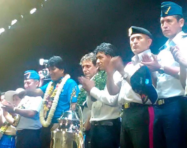 Este fin de semana fue invitado por el Presidente del Estado Plurinacional de Bolivia, Evo Morales Ayma, a presenciar la inauguración y algunos partidos de los Juegos Plurinacionales de Secundaria, que se llevan adelante en el Chapare. Se vio al seleccionador nacional, junto a Evo Morale, en la inauguración el sábado de la fase final de los Juegos Estudiantiles Plurinacionales de secundaria en el estadio de la localidad de Ivirgarzama, en la provincia Chapare de Cochabamba, en medio de una fiesta deportiva que fue matizada con danzas, poesía, mosaicos multicolores, música y un derroche de alegría juvenil.