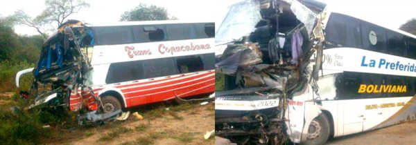 Camiri (elchacoinforma.com).- El bus de la empresa Trans Copacabana con placa 4250-SSU, conducido por Tito Barja Campos, que se dirigía de Yacuiba a Santa Cruz, colisionó contra el bus de la empresa La Preferida con placa de control 4101-RYF, llevado por Mario Monasterio García, que viajaba rumbo a Yacuiba.