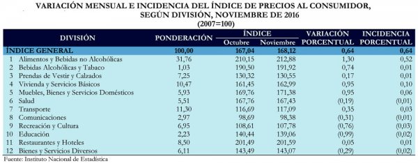 Del mismo modo, el índice general de artículos de consumo humano sobre el cual el INE, mide la inflación y el costo de vida es el siguiente: alimentos y bebidas no alcohólicas, bebidas alcohólicas y tabaco, prendas de vestir y calzados, vivienda y servicios básicos, muebles, bienes y servicios domésticos, salud, comunicaciones, recreación y cultura, educación, restaurantes y hoteles, bienes y servicios diversos.