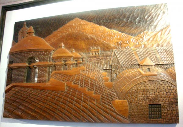 Los cuadros tallados en madera son verdaderas obras de arte e ingenio. Cada uno presenta un retrato de diferentes lugares del país, techos y calles coloniales de Potosí con balcones estrechos en alto relieve, incluso el empedrado tallado con gran maestría, son algunos de los detalles que se pueden observar en la singular obra de Velazco; animales tropicales, aves en vuelo, carretones entre otros, son cincelados con relieves que le dan profundidad e impacto a las obras.