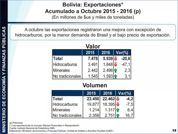 En términos de volumen, es decir, la cantidad de producto exportado, el ministro apuntó que “Bolivia bajó 4.2%, como efecto inmediato de la caída de los hidrocarburos (en volúmenes) que descendió 7.5%”.
