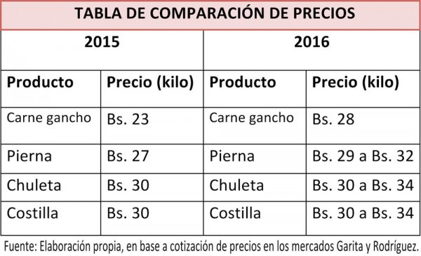 Mientras que en el mercado de la zona Rodríguez los precios estaban mucho más elevados. El kilo a Bs 30, el corte por pierna Bs 32, costilla y chuleta Bs 34.