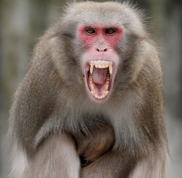 Un macaco de cara roja en el zoo de Stuttgart (Alemania), esta especie es el único mono nativo de Japón, por lo que se encuentra bien adaptado al clima frío que impera en gran parte del archipiélago durante el invierno (registrándose temperaturas de hasta -15 °C). Está recubierto de un espeso y lanoso manto de pelo pardo-grisáceo en todo el cuerpo, con la excepción de la cara, nalgas, palma de las manos y pies.