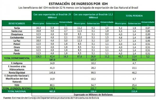 Entretanto, tres gobernaciones, que se encuentran en departamentos productores de hidrocarburos, expresaron esta semana su preocupación por el descenso de recursos fiscales por IDH en una proporción de Bs 153 millones por las menores nominaciones del Brasil, cuya demanda de gas natural boliviano cayó de 29 a 12.2 millones de metros cúbicos día. Adicionalmente, la pérdida por regalías fue estimada en Bs 94 millones.