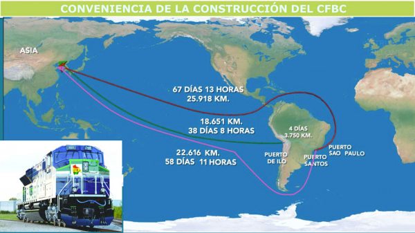Se prevé que el proyecto demande la inversión de $us 14.000 millones. Tendrá la longitud de 3.755 kilómetros. En su trazo original, comprenderá el puerto de Ilo-Perú, el territorio boliviano y llegará hasta el puerto de Santos, Brasil. Con la participación de Paraguay, el trazo cambiaría, pues se agregaría una variante, desde Roboré (Bolivia) hasta puerto Carmelo Peralta, en territorio de Paraguay.