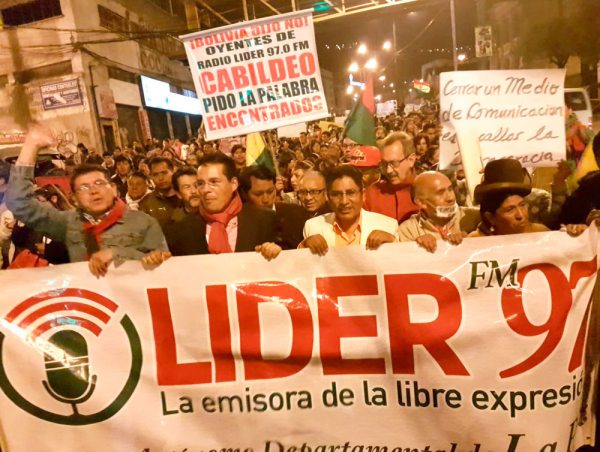 Con el apoyo de la Asociación de Periodistas de La Paz (APLP), la Federación de Juntas Vecinales de El Alto, Federación de Juntas Vecinales de La Paz, Comité Cívico El Alto, Universidad Pública de El Alto y representaciones de las 20 provincias se protagonizó la marcha de los trabajadores de la radio emisora Líder y de la Gobernación, encabezada por la primera autoridad del departamento, Félix Patzi.