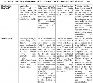 La Dirección de Prevención y Robo de Vehículos (Diprove), el fin de semana desbarató el clan Yanahuaya, deteniendo a siete involucrados en flagrancia, en la zona Mariscal Santa Cruz sector “B”, mientras desmantelaban un vehículo denunciado como robado, explicó el director de la entidad policial, coronel René Cerrudo.