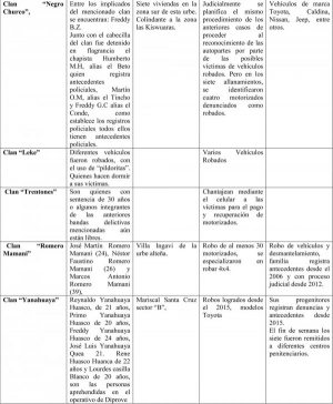 Este clan Yanahuaya, de acuerdo con los registros de investigación, se dedican exclusivamente al robo de motorizados, participaban de forma conjunta entre todos los familiares, con la finalidad de sustraer motorizados de marcas más comerciales, los cuales eran desmantelados en un garaje de propiedad de la familia. Los padres de las personas aprehendidas registran diferentes antecedentes de robo de vehículos, quienes en 2015 fueron sometidos a un proceso penal, por los mismos delitos de robo de vehículos, desmantelamiento y venta de repuestos robados.